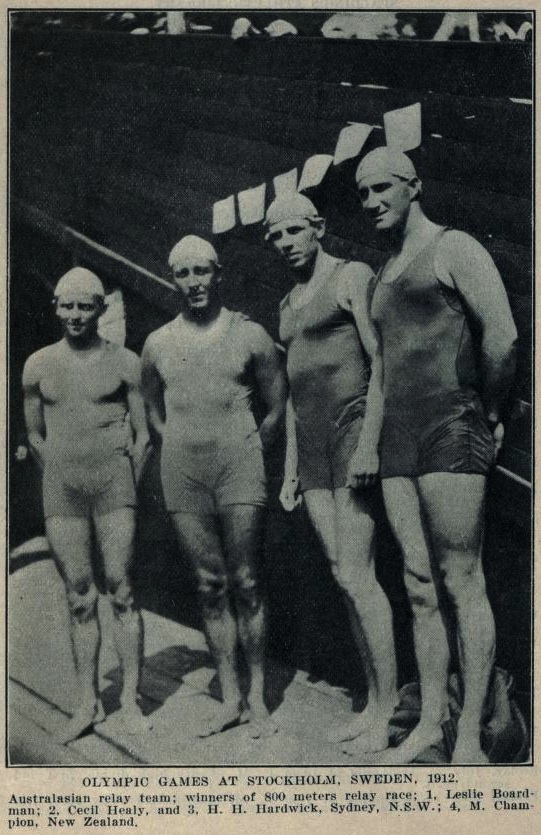 Malcolm Champion poses with the rest of the gold medal winning Australasian 4 x 200m freestyle relay team – 1912 Olympics