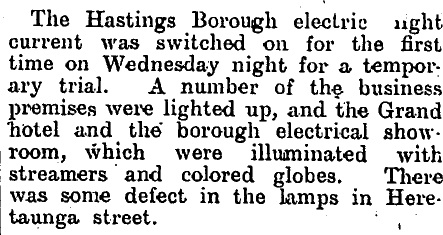 Back to the electrification of New Zealand – we now know that Wellington was the first city not just in the country but the entire southern hemisphere to snuff out gas lamps in favour of electricity, but when did Hastings make the big switch? This write up by Michael Fowler reveals the answer, it wasn’t until late 1912, over a year after the postcard was sent from Wellington.