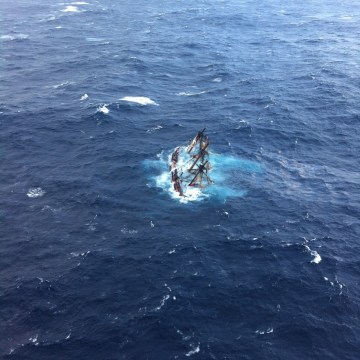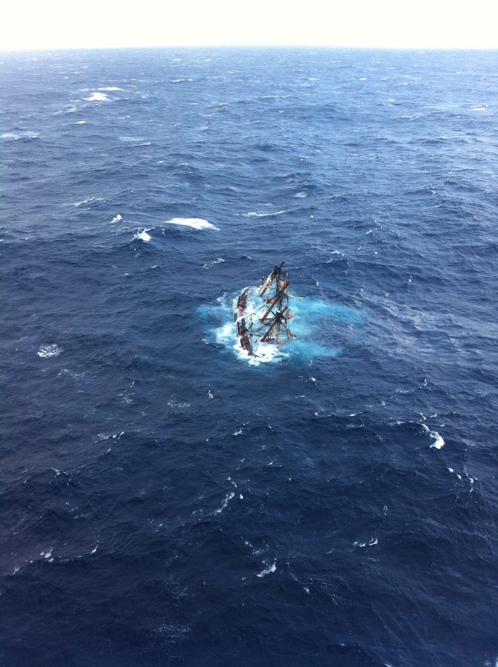 The HMS Bounty, a 180-foot sailboat, is shown submerged in the Atlantic Ocean during Hurricane Sandy approximately 90 miles southeast of Hatteras, N.C., Monday, Oct. 29, 2012. Of the 16-person crew, the Coast Guard rescued 14, recovered a woman and is searching for the captain of the vessel. U.S. Coast Guard photo by Petty Officer 2nd Class Tim Kuklewski.