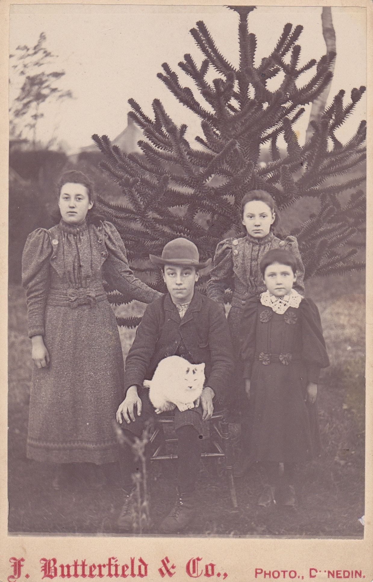 Four Dunedin children at their pet cat. 1893 – 1898.