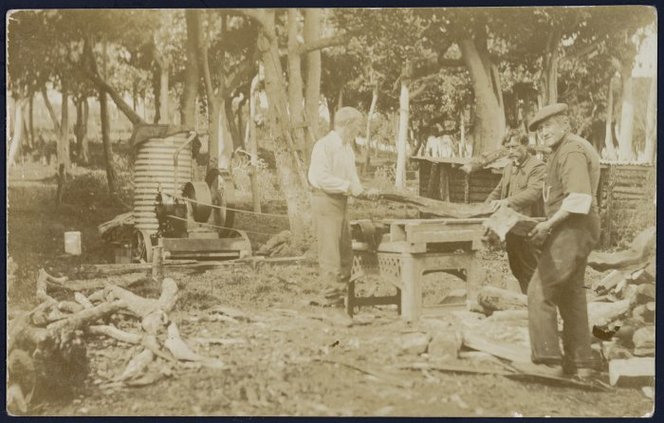 Noel Cox, George Rewai, and Felix Cox, cutting firewood, Chatham Islands. Guest, Ernest Matthias Capewell, 1873/1874-1957 : Photographs of the Chatham Islands. Ref: PAColl-4872-1-19. Alexander Turnbull Library, Wellington, New Zealand. http://natlib.govt.nz/records/23009499