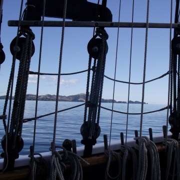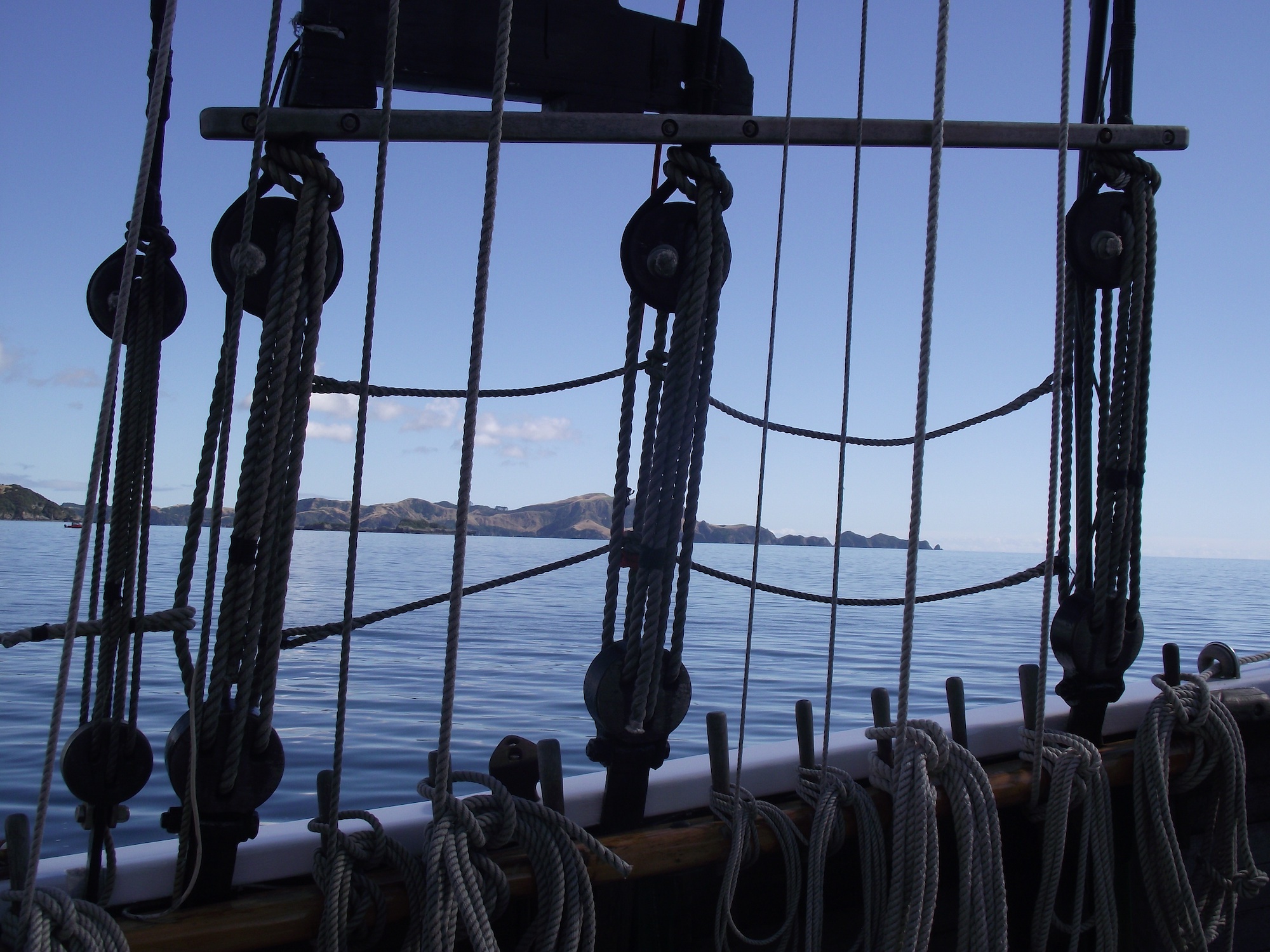 View of the Bay of Islands through the rigging of the R. Tucker Thompson