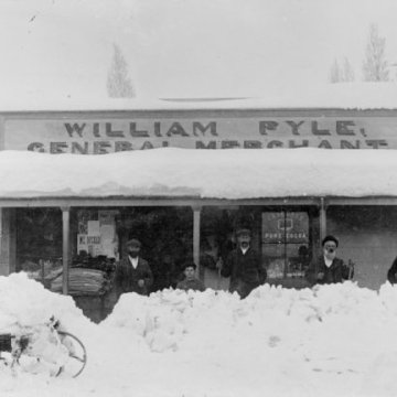 Snow at William Pyle’s general store, St Bathans, Central Otago – Photograph taken by F M Pyle. Paterson, M, fl 1966 : Photographs, particularly of St Bathans, Central Otago. Ref: 1/2-027134-F. Alexander Turnbull Library, Wellington, New Zealand. http://natlib.govt.nz/records/23193076