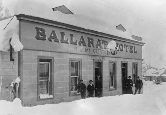 Snow at the Ballarat Hotel, St Bathans, Central Otago – Photograph taken by F M Pyle. Paterson, M, fl 1966 : Photographs, particularly of St Bathans, Central Otago. Ref: 1/2-027140-F. Alexander Turnbull Library, Wellington, New Zealand. http://natlib.govt.nz/records/22638058