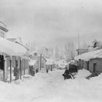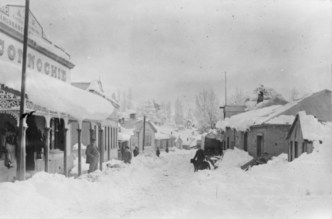 Street scene with snow, St Bathans, Central Otago – Photograph taken by F M Pyle. Paterson, M, fl 1966 : Photographs, particularly of St Bathans, Central Otago. Ref: 1/2-027137-F. Alexander Turnbull Library, Wellington, New Zealand. http://natlib.govt.nz/records/23244252