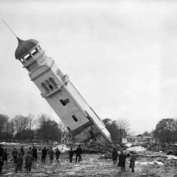 Demolition of the northern tower of the New Zealand International Exhibition in Christchurch. Webb, Steffano, 1880?-1967 : Collection of negatives. Ref: 1/1-005020-G. Alexander Turnbull Library, Wellington, New Zealand. http://natlib.govt.nz/records/23027460