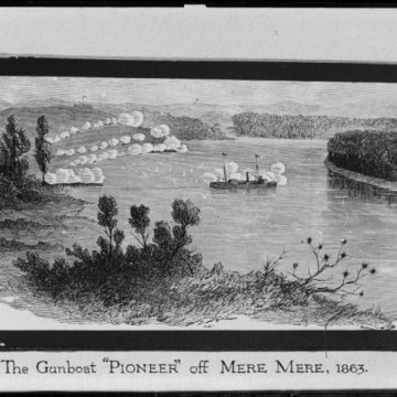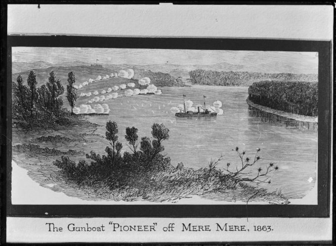 Illustration of the gunboat Pioneer off Meremere. Collis, William Andrews, 1853-1920 :Negatives of Taranaki. Ref: 1/2-015500-G. Alexander Turnbull Library, Wellington, New Zealand. http://natlib.govt.nz/records/22726568
