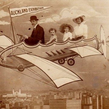 Auckland Exhibition visitors enjoy a ride in a mock up “flying machine”