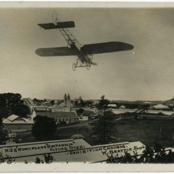 Beattie, William, 1864-1931. Bleirot monoplane Britannia flying over Auckland Exhibition Grounds. Thompson, D (Mrs) fl 1975 :Postcards of New Zealand scenes. Ref: PAColl-0892-12. Alexander Turnbull Library, Wellington, New Zealand. http://natlib.govt.nz/records/22305336