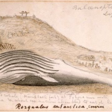 [Taylor, Richard], 1805-1873 :A dead whale (humpback fish) at Tohora nui with Tareha – about 100 natives assembled to eat it. Length 33 ft. July 5th 1841. Rorqualis antarctica. Cuvier.. Taylor, Richard, 1805-1873 :Sketchbook. 1835-1860.. Ref: E-296-q-025-1. Alexander Turnbull Library, Wellington, New Zealand. http://natlib.govt.nz/records/22867961