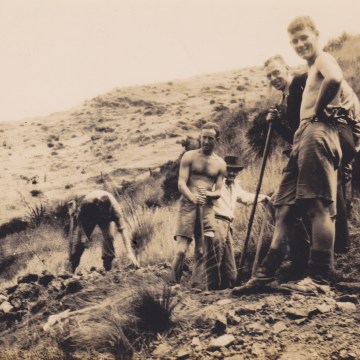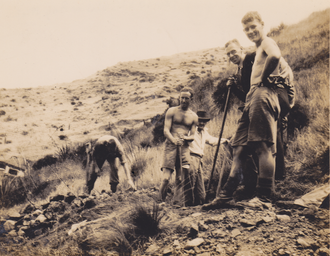 Members of No. 10 Platoon, Makara Battalion, New Zealand Home Guard, hard at work digging defensive positions at Makara Beach in 1942. From L to R, they are McDermott, Sheilds, Brawn, Pike, Bell-Harry and Thompson.