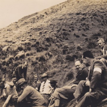 Members of the Makara Battalion, New Zealand Home Guard, take a break in the hills above Ohariu Bay, Makara, 1942. They are, L to R, Fowler, Bridge, Bull, Welsh, Milwood, Hall, Elice, Rhodes (above) and Hertzfield (below). Several of the men are wearing their Home Guard armbands – an example of which, from a member of the Makara Battalion, survives at the National Army Museum Te Mata Toa. Lemuel Lyes Collection.