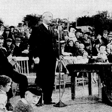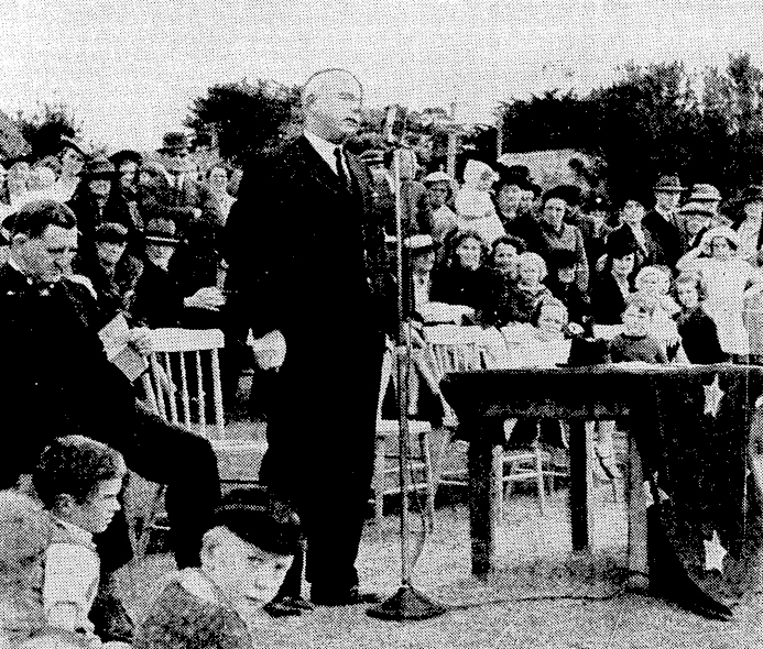Prime Minister Peter Fraser addressing the Makara Battalion of the Home Guard and Women’s War Service Auxiliary and Red Cross units at Karori Park, 30 November 1941. Evening Post, Volume CXXXII, Issue 132, 1 December 1941, courtesy of Papers Past