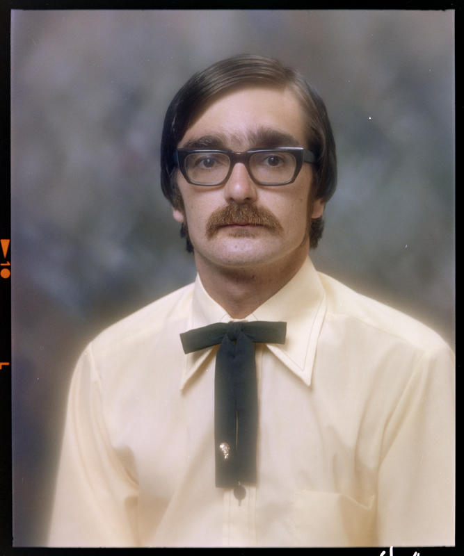 Seated man wearing glasses and KFC uniform shirt and bow tie. A gold badge in the shape of the head of Colonel Sanders is pinned to his tie, indicating his role as a store manager. New Plymouth, New Zealand, 8 December 1977. Swainson/Woods Collection, Puke Ariki