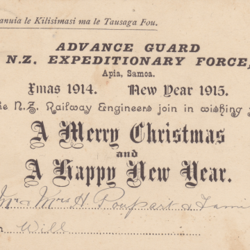 Card sent by New Zealand engineer in Samoa wishing the recipient a Merry Christmas and a Happy New Year. 1915 Would be a tragic year for many New Zealanders.